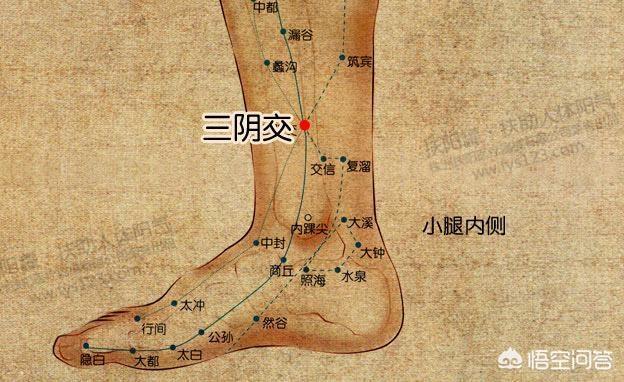 (3) 三阴交:坐姿时,屈膝呈直角,位于腿部内踝尖直上,胫骨后缘靠近凹陷处。每天睡前顺时针按摩5-10分钟,能起到安神,调肝健脾补肾的效果。
